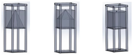 Before the study for dimensional parameters applied to the OWC wave energy converter, the shape of the air-chamber was examined first. Under conditions of the space allowed in the template type offshore structure for the installation of an OWC wave energy converter, a cubic box with various shapes of roof was taken into consideration. Since the roof is the location for the in/outlet of the compressed air, the efficiency of the energy converted from the captured wave energy in the chamber may be influenced by the shape of the air-chamber. As presented in Figure 4, three air-chambers located in the template structure with various shapes of roof were considered. The first one has a quadrilateral triangle shape cap direct from the bottom of the chamber and the second one also has a quadrilateral triangle cap but from the middle part of the chamber-box while the third one maintains as a cubic box. All of them have the same size of in/outlet orifice on the apex of the roof.