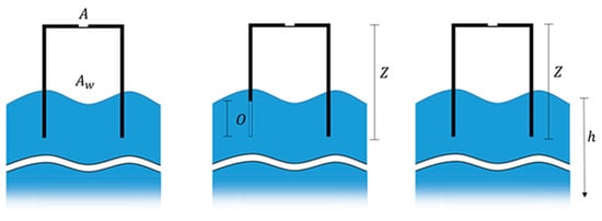 Figure 5a–c present schematic drawings of the side view of the OWC converter installed in an offshore template structure, where parameters such as the ratio of orifice area RA, ratio of chamber height Rz and ratio of the front gate opening Ro are correspondingly presented in Figure 5a–c. The dimensions of the device related to parameters to be examined are all marked in the figure and shown in variables as A, O and Z. A table for the variation of these parameters is presented in Table 1. It is noted that because too many parameters are to be analyzed when one parameter is a variable the other parameters will be set as constant. Such a referenced model is set as: RA = 0.4% (A = 144 m2), RO = 0% and RZ = 50%, where they are shown in bold letters in the table.