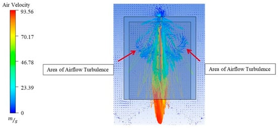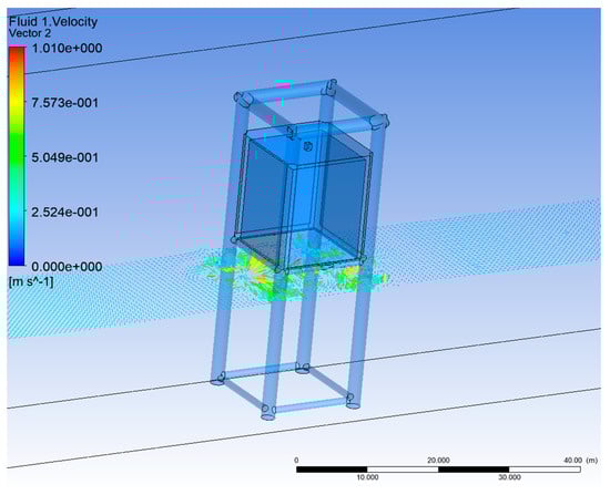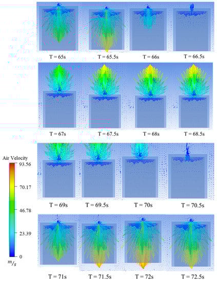 During the analysis the variation of the air-flow in the chamber can be obtained. Presented in Figure 6 is the water-flow around and through the template structure. It shows that the turbulence is small but, if the dimensions of the structure are larger than 1/5 wavelength, the diffraction effect must be considered as the analysis performed for the large-size tension-leg platform [,]. The other factor is that the applied waves based on local environmental conditions are quite small in terms of the wave-height and length. Presented in Figure 7 is the typical variation of air-flow in the chamber, where the flow presented in a vector form can be observed clearly. As shown in the figure, the strongest velocity of the air-flow concentrates in the central space of the chamber along with the vertical line of the orifice while near the orifice in the upper part of the air-chamber a significant vortex response can be observed. Along with the time the variations of the air-flow can also be observed. As is shown in Figure 8, an obvious alternately inward and outward flow of the air are presented along with the time variations. By following the time history of the flow-motions shown in the figures, the inward/outward motions of air-flow are in a period pattern along with the wave heaving motion. It also shows that the outward velocity is larger than the inward velocity. This is due to the effect that when the air flows inward it may encounter the water surface inside the chamber and affect the velocity.
