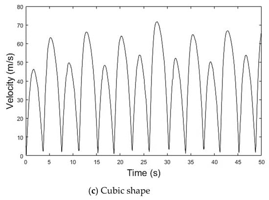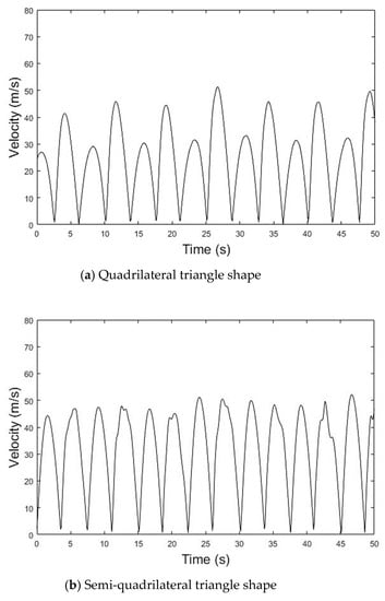 When the conditions such as the opening ratio of the in/outlet orifice, the ratio of opening gate and the ratio of submerged depth are set as a constant as RA = 0.4%, RO = 0.5%, and Rz = 0, the speeds of the air-flow from the orifice for three types of shape of the air-chamber are presented in Figure 9a–c corresponding to various shapes of the chamber. It is noticed that the velocity of outflow and inflow are both presented positively, which are taken as a spatial average across the orifice area. The maximum velocity is 51.4 m/s, 52.1 m/s and 71.8 m/s corresponding to three types of chamber roof, namely, quadrilateral triangle, semi-quadrilateral triangle and cubic shape. The average velocities corresponding to these three types of chamber-shape are 39.2, 46.1 and 59.1 m/s. It shows that for maximum velocity of the air-flow from the orifice, there is not much difference between the first two types of chamber-shape but for the last type the cubic one, the maximum velocity can reach a value higher than the other two by 38%. The average velocity from the orifice of the cubic type of air-chamber is 28% higher than that from the semi-quadrilateral triangle type and 50% higher than that from the quadrilateral triangle type of air-chamber. Therefore, it was recommended that the chamber shape for the OWC wave energy converter installed on the offshore template structure under study will be a typical cubic box with in-outlet orifice on the apex of the chamber. Except for the shape, the dimensions for the orifice area and height of the chamber and additional opening of front gate will be discussed in the following sections.