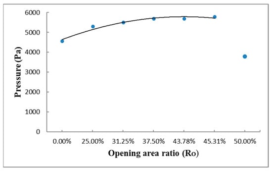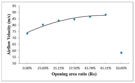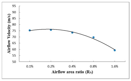 The velocity presented in Figure 10 is the average of first 1/3 maximum (significant) velocity of each time-history analysis corresponding to the area ratio of orifice cross-section RA. It is observed that corresponding to the increase of the opening ratio RA, the airflow velocity decreases nonlinearly. The airflow velocity drops slowly at the early stage corresponding to the area-increment of orifice opening and then decreases fast after the opening ratio of the orifice area RA is larger than 0.8%. When the opening-ratio RA increases to 1.6%, the airflow velocity is reduced to 60 m/s.