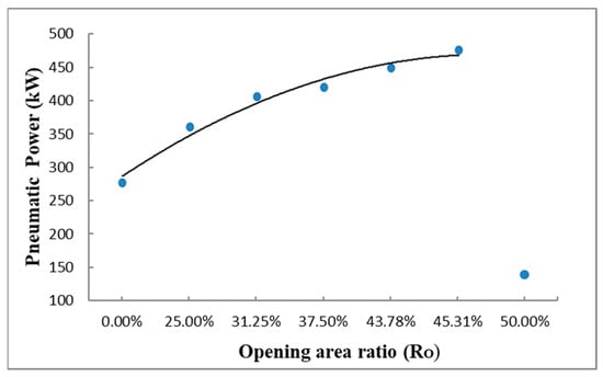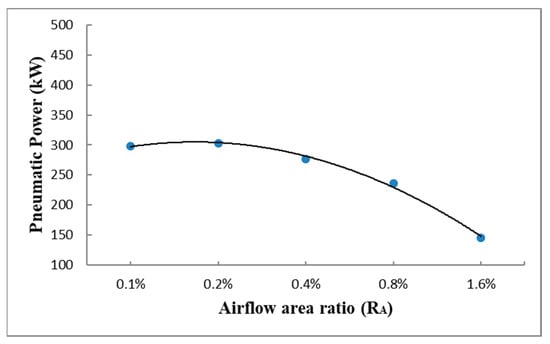 Presented in Figure 16 is the average power of airflow in 1/3 maximum pneumatic power for various opening-ratios of OWC gate to the height of the chamber of OWC. It is observed that corresponding to the increase of opening-ratios of OWC gate the pneumatic power also increases till the ultimate peak value. The increment of the pneumatic power is in a nonlinear but stiffer slope compared to the air-pressure increment trend. The maximum power obtained corresponding to the gate-opening in this case is 480 kW when the gate-opening ratio is 45.31% to the height of the air-chamber of the OWC. However, when the opening-gate is above the lowest level of the water, the pneumatic power drops to 139 Pa, which is only 29%, less than 1/3 of the highest power that can be obtained.