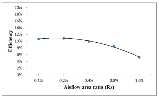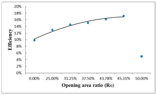 Presented in Figure 17 is the efficiency of power of airflow converted from the OWC for various opening-ratios of OWC gate. It is observed that corresponding to the increase of opening-ratios of OWC gate the converting efficiency of the power also increases till the ultimate peak value. The increment of the pneumatic power is also in a stiffer slope compared to the air-pressure increment trend. The maximum converting efficiency of the power obtained corresponding to the gate-opening in this case is 17.2% when the gate-opening ratio is 45.31% to the height of the air-chamber of the OWC. Compared to the case without a gate-opening, of which the converting efficiency is 9.9%, the converting efficiency obtained from a larger gate opening is much higher. As indicated in the numbers the increase of the converting efficiency can be raised by 74% from the largest opening of the gate. It is also noticed that the converting efficiency will drop dramatically if the gate opened above the lowest water level. As is shown in Figure 17, the efficiency is 5.0% for an over opened gate (RO = 50%). That is reduced by 70% compared to a case, where the gate is opened in a ratio of 45.31%, slightly over the lowest water level.