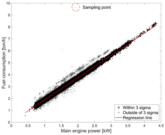 The outliers of the current data set were identified using the relationship between the power of the main engine and fuel consumption, which was identified by simple linear regression [27]. Under the assumption that the difference between the values predicted by the regression analysis and the observed values are normally distributed, the observed values outside the 3 range were labeled as outliers. Figure 1 shows a scatter plot of the fuel consumption vs. engine power, where the solid line is the linear regression result, and the data points inside and outside the 3 range are indicated by different symbols. One major outlier was sampled (as indicated in Figure 1), and the time-series data for the fuel consumption and engine power at the corresponding point is shown in Figure 2. Given the trends in both curves over time, the engine power at the sampling point was regarded as abnormal. Since the ratio of outliers detected at this stage to the total sample size is relatively small, data sets containing such values were removed from the raw data sets rather than replacing them with other values.