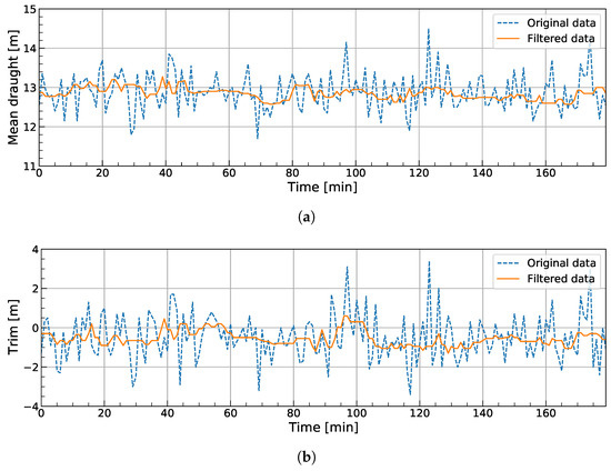 Time-series data filtered by median filter: (a) Mean draught, (b) Trim.