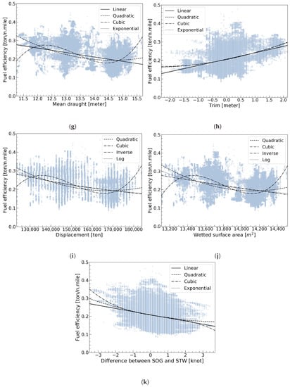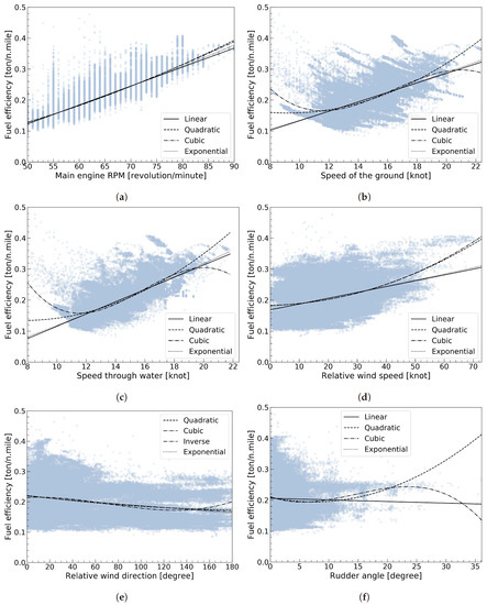 The energy consumption of a ship is closely related to its operating parameters and can be expressed by various physical relationships. Simple linear regression can only accurately describe highly linear relationships between the variables. Therefore, in this study, various functional forms, such as quadratic, cubic, inverse, logarithmic, and exponential, were used in addition to linear fitting to more accurately describe the variables. Figure 4 shows the top four functions with high coefficients of determination () among the different types of curve fittings compared with scatter plots of the fuel efficiency as a function of each ship parameter. Each ship parameter was converted to the appropriate data distribution using the function with the highest coefficient of determination (see Table 5). However, if the difference between the coefficients of determination of curve fitting functions was not significant, the function with the lower order function was selected to reduce the complexity of the model.