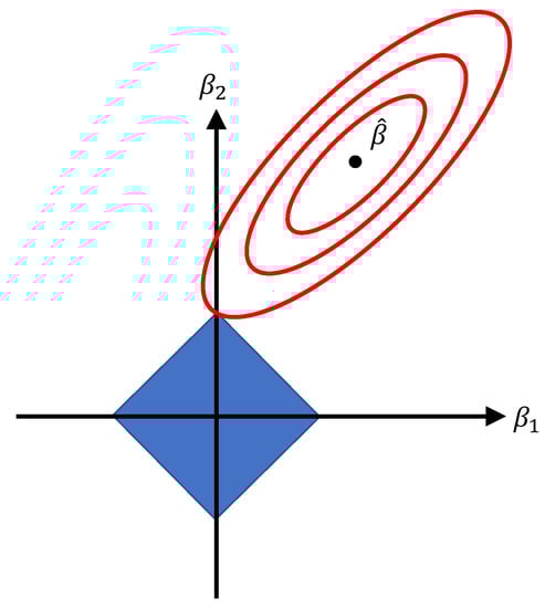 LASSO regularization is a method of reducing the regression coefficients of the independent variables that are less dependent on the dependent variable due to the assignment of a tuning parameter to the magnitude of the regression coefficient. Assigning the regression coefficients of insignificant variables as zero allows for variable selection and thus produces models with high analytical power [45]. LASSO regularization adds a term that minimizes the sum of absolute regression coefficients as a constraint and minimizes the sum of the squared residuals normally used in regression analysis, as in Equation (5), i.e., the objective is to find regression coefficients that minimize the sum of the two terms (, ). As increases, the degree of regularization increases, and the regression coefficient decreases. When decreases, the degree of regularization decreases, and when it becomes 0, a general linear regression model is achieved. Figure 5 represents the geometric structure of the LASSO regression, and the coordinate axis shows the estimator of each regression coefficient. The residual sum of squares is defined by an elliptic contour, and the constraint boundary is represented by a square rotated area. The estimated LASSO regression coefficient converges to zero at the point where the contour and the constraint boundary meet, allowing the variable selection.