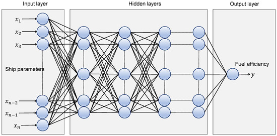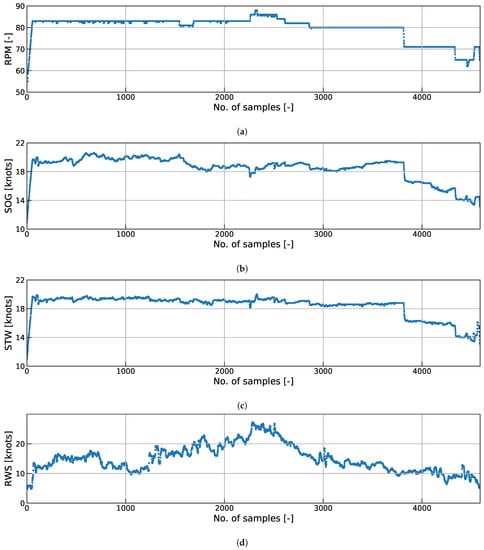 If the model is used during pre-sailing planning or during sailing for the purpose of predicting fuel consumption and energy-efficient sailing, the variables that can be adjusted on the actual vessel by the ship operator’s actions or environmental variables that may affect them should be selected as the main input variables. These inputs should be either directly entered by the user or automatically entered from the on-board system. Therefore, the main variables of the model were selected considering the experience of ship operators and the vessel energy efficiency measures published by the American Bureau of Shipping [9]. These guidelines propose operational measures for reducing fuel consumption and greenhouse gas emissions. The main operational factors relevant for reducing fuel consumption are voyage speed optimization, weather routing (considering both energy efficiency and safety), trim/draught optimization, and autopilot optimization.