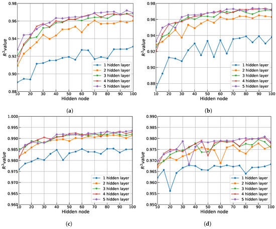 Effect of changing the number of hidden neurons and layers on R2: (a) Case 3, (b) Case 4, (c) Case 7, and (d) Case 8.