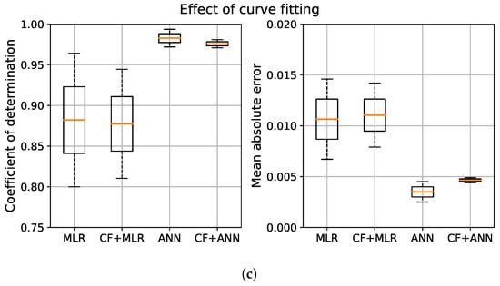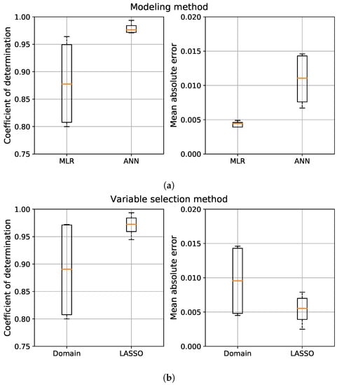Table 8 lists the predictive performance of the model cases using test data set, and Figure 8 compares the performance of the models according to the modeling method, variable selection method, and the application of curve fitting. Box plots were used to facilitate the observation of the distribution of the model performance, where the bottom and top of the box represent the first quartile (Q1) and third quartile (Q3), respectively, and the horizontal line within the box is the median. The top and bottom error bars represent the Q1 − 1.5 × IQR (interquartile range between Q1 and Q3) and Q3 + 1.5 × IQR of the data, respectively.