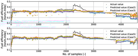Ship operations can generally be divided into ballast and laden, and training the model by dividing these sections would further enhance the reliability of the model by reflecting the character of each navigation pattern. However, unlike bulk carriers or tankers, container ships typically load and unload containers at multiple ports during one voyage, which made it difficult to classify the trade pattern [43]. In addition, some data sections that were invalid for analysis were removed in the pre-processing procedure, and hence, the amount of valid data varied for each voyage. Therefore, the model was trained without distinction by navigation patterns. In other words, the entire data set was randomly divided with a ratio of 7:3, wherein the former set was used as the training set, and the latter used for evaluating the developed model.