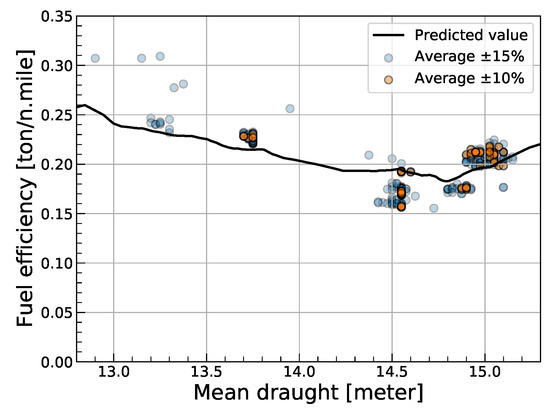 The energy consumed by the vessel also depends on the loading conditions [43], and adjusting the draught and trim of the vessel with the appropriate amount of ballast water is a simple and inexpensive way to optimize the energy use of the vessel. The hull shape is traditionally designed to have optimal energy efficiency according to specific draught and trim. Even with the same volume displacement, ship resistance varies depending on the draught and the trim, which may affect fuel consumption. In addition, increasing the amount of cargo increases the draught and displacement of the vessel, which increases resistance and fuel consumption. In-service data of the several round-trip voyages can include not only changes in trim and draught due to the consumption of fuel and freshwater but also changes in trim and draught due to different loading conditions for each port-to-port section. In this study, we used such data set to implement the model to reflect the impact of loading conditions on fuel consumption.