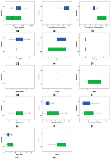 Distribution of the potentially relevant variables stratified by whether excursion occurred: (a) Water depth, (b) Percentage of thrusters, (c) Percentage of generators, (d) GNSS, (e) HPR, (f) Taut wire, (g) Inertia system, (h) Gyros, (i) MRUs, (j) Wind sensors, (k) Wind force, (l) Current speed, (m) Wave height, and (n) Visibility.