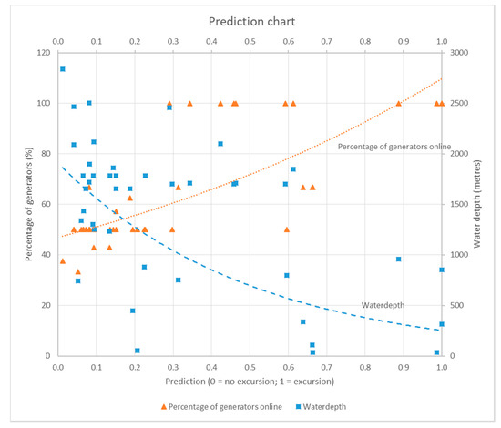 This probability P varies between 0 and 1: the closer to 0 the lower the probability of excursion, and the closer to 1, the higher the probability of excursion. According to the obtained value for P, the case will be classified into one of two groups: no excursion (0), for probabilities of less than 0.5 (in other words, the probabilities of having an excursion are less than 50%, hence this case would be classified as no excursion), and excursion (1), for probabilities of more than 0.5 (when the probabilities of LoP are above 50%).
