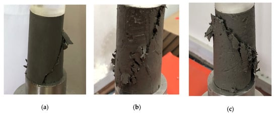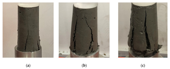 - After flattening the excessive clay sample with an aluminum scraper, the sample was left vertically in position for approximately 30 min. Then, both ends of the sample were wrapped with filter paper and marked. In addition, the prepared samples were placed horizontally into a water tank for curing at room temperature and subjected to an unconfined compressive strength test on the scheduled curing day.