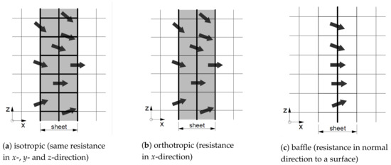 The formulation of the momentum conservation equations differs depending on the type of porosity implementation. The pressure-drop application varies for the isotropic and orthotropic porous media and the porous baffle implementation, as outlined in Figure 2. In the case of a porous-baffle implementation, an internal pressure-jump condition is applied at the cell faces of a geometrically defined surface with zero thickness. This is outlined in Figure 2c. At the mesh cell faces of this surface, the pressure-drop as defined by (1) is applied to the Navier–Stokes momentum equation, which is then written as