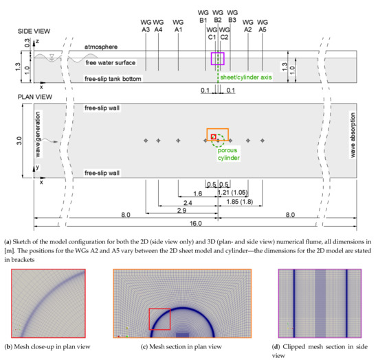 A sketch of the model configuration including all boundary conditions and wave gauge (WG) positions is shown in Figure 3a. The WGs with index A (WG A1–A5) in the numerical tank correspond to the WGs in the experimental setup. These are the closest ones available for a direct comparison between CFD and experimental results. In order to study differences between the various types of porosity implementations closer to the structures, the WGs B1–B3 and C1–C2 have been added to the CFD models. The WGs B1–B3 have been used for the 3D model with the cylinder and the WGs C1 and C2 have been used for the 2D model with the sheet. The coloured rectangles in the sketch refer to corresponding sections of the mesh close to the porous cylinder in the 3D model that are shown in the Figure 3b–d. Figure 3b,c show mesh sections in plan view and Figure 3d shows a section of the mesh in side view along the vertical symmetry () plane across the cylinder axis. It is important to note that the porous cylinder is not resolved explicitly in the mesh, but is part of the fluid domain instead, with the effect of the porous structure on the flow represented by the momentum source terms. For a better understanding of the 3D model setup, a snapshot of the wave interaction (with the cylinder represented by the orthotropic porous media) is shown in Figure 4.