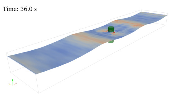 The top boundary of the domain was set as an atmospheric condition, and the bottom, front and back boundaries were set to free-slip wall conditions. For the wave modelling, the OlaFlow/IHFoam library was used with its static boundary implementation and active wave absorption method. At the generation boundary on the left-hand side of the flume, a regular 2nd-order Stokes wave was applied by means of its free-surface elevation, , (via the -field) and velocity profiles (via the -field). The input wave is propagating towards the pure wave absorption boundary on the right-hand side of the flume. The active absorption method minimizes wave reflections by correcting the incoming free-surface elevation, by imposing the incident velocity profile in the opposite direction to the wave propagation. The latest version (November 2019) of OlaFlow/IHFoam’s method [57] was used, where a constant velocity profile is imposed at the wave generation boundary and a variable velocity profile is used at the pure absorption boundary. The former corresponds to shallow-water theory () and the latter covers both intermediate () and deep water ranges (). With this active absorption method, the reflection coefficient was estimated to be = 1% for the present wave condition, calculated with the three-gauge method by Mansard and Funke [58] for an empty numerical tank. With this low level of wave reflections at the boundaries, the internal wave field is quasi-undisturbed.