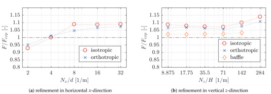 Prior to the comparison of the results obtained from the different implementations, a mesh convergence study was performed separately for each type of porosity implementation. The mean amplitude of the horizontal force on the 2D sheet, F, was compared for a number of meshes. The meshes were generated with a successively increasing number of cells separately for the horizontal x- and vertical z-direction, starting off from the cell size in the clear flow region ( = 20 mm). Firstly, the horizontal cell length, , was decreased successively until a quasi-converged state was reached. Secondly, the vertical cell length was reduced, while was kept constant. The averaged force amplitudes obtained from the CFD results, F, have been scaled to correspond to the experimental sheet width of 1 m. F has then been normalized over the mean force amplitudes obtained from the experiments, = 382.63 N. Figure 5 shows the normalized force amplitude, , over the mesh refinement levels in terms of number of cells per sheet thickness in x-direction, , and number of cells per wave height in z-direction, . For the baffle implementation, the refinement level was only investigated in vertical z-direction as it has zero thickness. No result was obtained for 284 , since the skewness of the cells would have been excessive. For all other models, highly skewed cells have been avoided.