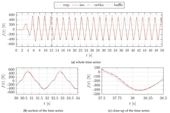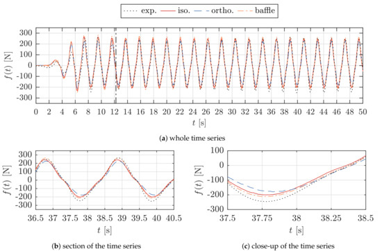 All types of porosity implementation are capable of reproducing the shape of the time series, which exhibits a non-sinusoidal shape due to the quadratic pressure-drop. The notable deviations between the CFD and experimental results for the initial transient section of the time series in Figure 6a are due to differences in the wave ramp-up between the numerical model and the physical wavemaker. The deviations concerning the wave ramp-up have been discussed in previous work, [33], where the free surface elevation has been validated for a range of regular wave conditions and porosities. The experimental results are slightly contaminated with wave reflections, shown for a section of the time series in Figure 6b. The numerical results exhibit a clean periodically steady-state after about t = 24 s. The numerical results agree well among each other, where only minor deviations can be observed at small local sections of the signal, which is outlined for an example in Figure 6c. The mean force amplitudes, F, of the CFD results are 391.19 N for the baffle implementation ( = 1.024), 407.84 N for the orthotropic implementation ( = 1.066) and 415.54 N for the isotropic implementation ( = 1.086).