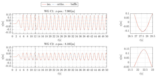 Next, the wave elevation, , at the WGs close to the structures is assessed. Here the whole time series for a physical runtime of 50 s and close-ups of sections of the time series are presented. Again, the vertical lines indicate the point in time when the wave has travelled across the tank and back to the WG.