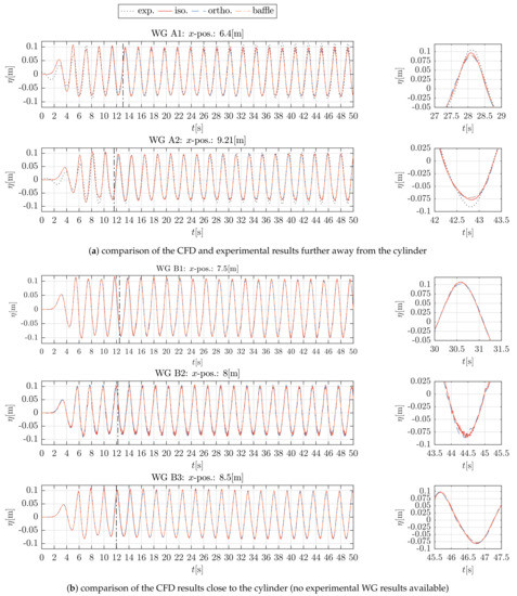 Similar to the time series of the force results, the figures exhibit differences at the initial transient section and wave reflections in the experimental results. Again, the overall agreement between CFD and experimental results is relatively good. The most noticeable differences can be observed between the CFD results for WG A1, positioned 1.6 m before the cylinder (Figure 9a). The isotropic implementation produces larger amplitudes after the wave has travelled across the tank and back to the centre. For the WG A2, 1.21 m after the cylinder, the results match very well. The time series for the WG B2 in the center of the cylinder exhibits small ripples for all types of porosity implementation. The ripples are suspected to be a result of instabilities in the VOF phase-fraction ()-field and to be related to the very fine mesh in the cylinder centre due to mesh generation procedures.