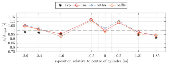 CFD and experimental results of the normalized mean wave amplitudes, , for all WGs before and after the cylinder. The position of the center of the cylinder is indicated with a dashed vertical line and the cylinder front and back are indicated with solid vertical lines.