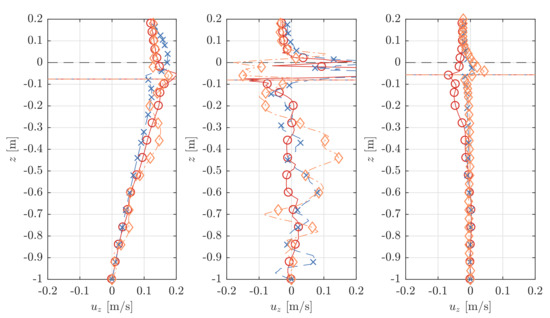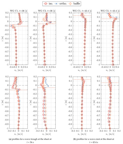 The velocity profiles are assessed by means of a comparison between the CFD results from models with different types of porosity implementations. The positions of the velocity profiles correspond to the WG positions around both the sheet and cylinder; see Figure 3a. A limited number of selected profiles and points in time are presented for one wave trough and one wave crest each. These indicate the overall trend of results.