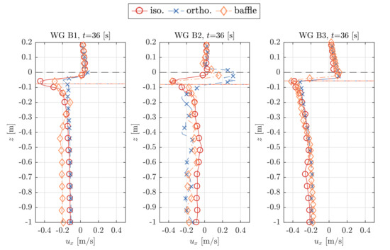 Figure 5a indicates 8 cells per sheet thickness, , results in a converged force amplitude, F, for an isotropic implementation. Further horizontal refinement has an insignificant effect on the result. For the orthotropic implementation, convergence can be observed towards 32 . The difference between 16 and 32 is 3% relative to the smaller value. No clear convergence behaviour can be determined from Figure 5b for the number of cells per wave height in z-direction, , for either of the implementations. It is not clear why the value of F in both porous-media implementations (isotropic and orthotropic) is seen to increase significantly for an increasing number of cells in the vertical direction, but this is suspected to be linked to the smeared nature of the air-water interface of the VOF interface capturing method. Although not presented in the figures here, the comparison of the velocity profiles along the water column for the gauges WG C1 and WG C2, 0.1 m before (x = 7.90 m) and 0.1 m after (x = 8.10 m) the sheet, confirm the results above. Based on the number of cells per sheet thickness, , the profiles of the horizontal component, , and the profiles of the vertical velocity component, , require a minimum of 8 for the isotropic and 16 for the orthotropic implementation, to achieve a reasonable converged profile in front of the sheet at WG C1. The vertical mesh size, , has barely any influence on the velocity profiles, and , before and after the sheet for either the volumetric (isotropic and orthotropic) implementation and the baffle implementation. There are no significant differences after the sheet and only small deviations in front of it, where the largest deviations of are located along the free-surface. Overall, these differences are considered to be insignificant.