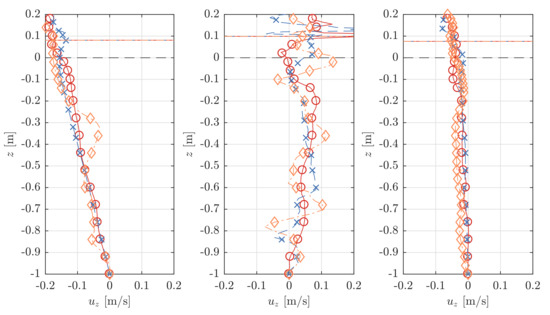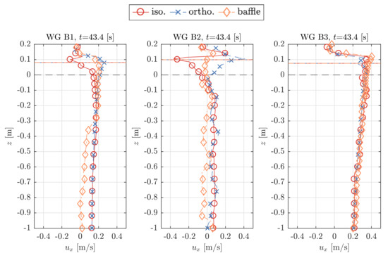 Figure 11 shows examples of the velocity profiles of the horizontal component, , and the vertical component, , with a distance of 0.1 m before (WG C1) and after (WG C2) the sheet. The dashed black horizontal lines indicate the mean water surface level with a water depth of h = 1.0 m. The continuous coloured horizontal lines represent the instantaneous water level at a specific time step. Both the horizontal and vertical velocity profiles, and , cover the whole water column and a section of the air phase above the water level.
