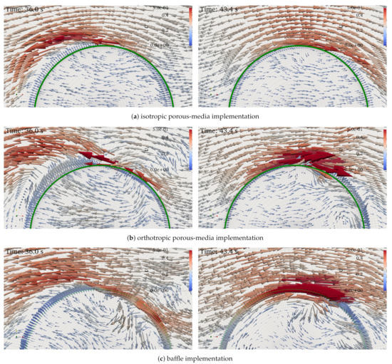 Despite the very good agreement between all numerical results in terms of the force response and the flow field further away from the structures, differences are present for the flow field very close to the structure. From a qualitative point of view, the isotropic porosity implementation seems to produce flow patterns that are smoother compared to the orthotropic porous media and porous-baffle methods. In particular, the orthotropic implementation creates a more chaotic flow field and higher local velocities (for exactly the same mesh as the isotropic implementation), see Figure 14b. This could explain the reason for the requirement of smaller time steps in order to meet the target maximum number during the automatic time stepping process—which increases the computation time for the orthotropic implementation. The flow patterns agree better between the isotropic porous-media and the baffle implementation, see Figure 14a,c. This corresponds to a better match of the force results between the isotropic and baffle implementations, see Figure 7. The orthotropic implementation results in larger deviations for both the force results and the qualitative flow field, Figure 14b.