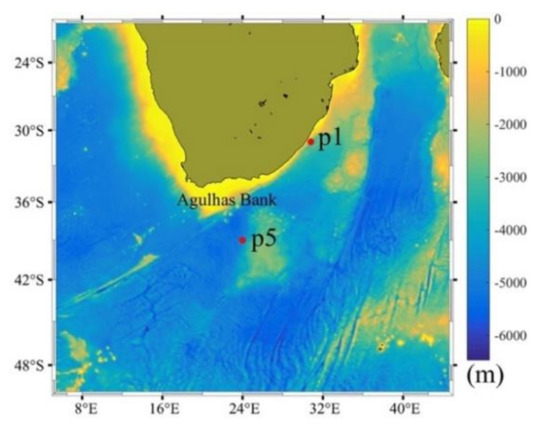 Models such as SWAN are classified as Third Generation Spectral wave models. The configuration of SWAN version 41.31 (Simulating Waves Nearshore) [31,32] grid model covers the AC system region and it extends from 50° S, 19° S up to 5° E, 45° E, at spatial resolution of 0.05°. The bathymetry grid data Etopo1 [33] come from the NOAA’s National Geophysical Data Centre, with a resolution of 1 min of degree in latitude and longitude, which was linearly interpolated to the model grid. Figure 1 shows the bathymetry data and the distribution of the SWAN output locations P1 (31° E, 31° S) and P5 (25° E, 38.36° S).