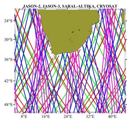 Orbit segments of Jason–3 (green), Jason–2 (red), Saral–Altika (blue) and Cryosat (magenta).