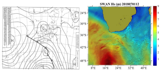 During the winter months (May to October) severe storms are common in the Agulhas Current region. According to South African Weather Service synoptic chart, on the 30 June 2018, a deep depression (976 hPa) and the associated cold front located at 47.8° S and 16° E were observed traversing quickly the area of study from West to East on 1 July 2018 (984 hPa). Figure 4 (left) shows the synoptic conditions for the 1 July2018.