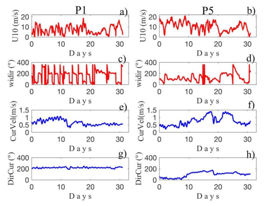 Time series for the Wind speed (a,b), Wind Direction (c,d), Current speed (e,f), Current direction (g,h) at P1 (left) and at P5 (right). Simulation period: 15 June 2018–15 July 2018.