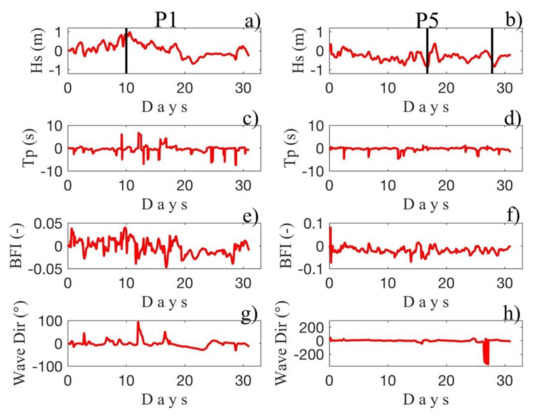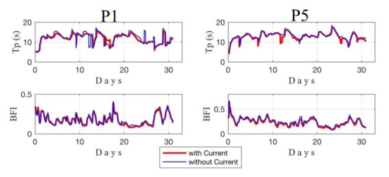 In addition, it was observed that, after the decrease of the peak period, the BFI reached the maximum value. In general, at location P1 and P5 the high values of BFI observed are in a direct relation with a decrease of the Tp (Figure 7) as reported earlier in other studies [50,51,52].