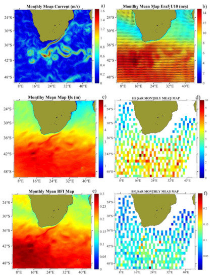 In the case of the BFI, the comparison between the modeled and observed composites (Figure 9e,f) exhibits the highest values located in the ACR and a few high values are observed in the southern border, as occurred with the Hs. A remark can be done emphasizing the fact that the numerical simulations are very useful since they can provide information in those places where the satellite instrument lacks as happens in this case with the AC (Northern part was not observed by SAR, Figure 8). The modeled monthly composite of BFI shows that the highest values are located in the AC and in the ACR. It is necessary to point out that the BFI did not result too high as to say that we found freak waves, but the results of this study indicate that there is direct correlation between the Agulhas Current intensity and the Hs and BFI.