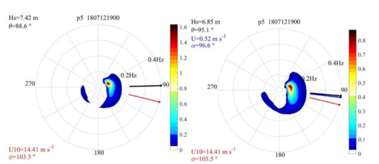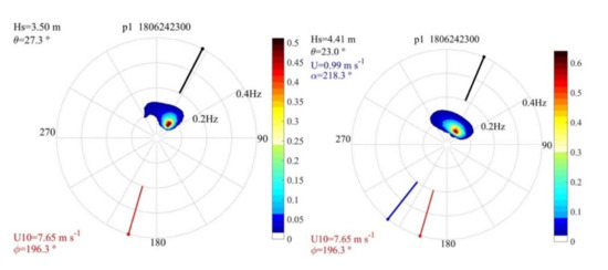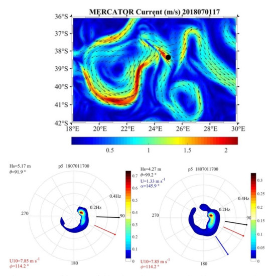 The complexity of the spectra is shown in Figure 11 and Figure 12. Two different dates are analyzed at P5 (coordinates −38.36° S, 25° E. Figure 1) without and with current, respectively, on the 1 July 2018 at 17 UTC and 12 July 2018 at 19 UTC.