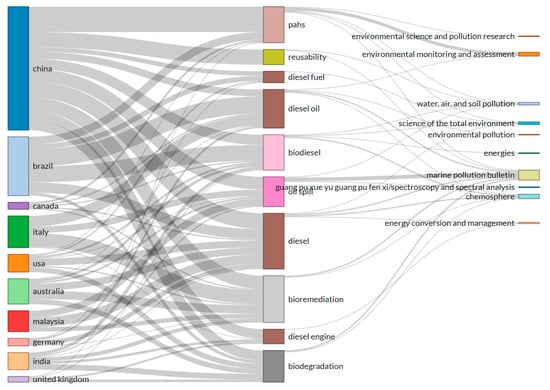 Within the period analyzed, several countries were quite prolific with a high number of author shares, such as China, Brazil, USA, India, Australia, and Malaysia. A three-field-plot (Sankey diagram) of Country, Keyword and Sources (journals) in Figure 1 depicts the proportion of research topics for each country and the publishing journals. Items in the top ten ranking from each metrics were selected. As shown in the figure, China has the highest publication in the past 10 years, showing a diverse range of topics. Chiefly, their research focus was heavily weighted in polycyclic aromatic hydrocarbons (PAHs) and demonstrated a strong relation with the Environmental Monitoring and Assessment journal. China is also the only country highlighting “reusability” in author’s keywords. On the other hand, bioremediation and biodegradation, which are regarded as the same subfield, received a fair share of attention from all countries. The sources where these studies were published were mainly distributed between Marine Pollution Bulletin and Chemosphere.