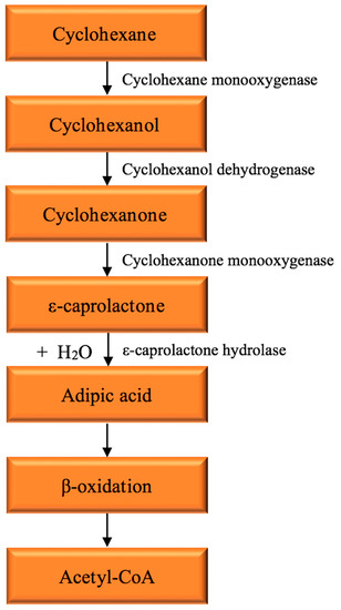 Referring to Figure 5, cycloalkane degradation has a slight contrast mechanism with n-alkanes. The cycloalkane is firstly oxidized by the enzyme called hydroxylase to form a cycloalkanol. Cycloalkanol is produced from the reaction of enzyme attacking the alkyl group when oxygen is present. The dehydrogenation of cycloalkanol then produces naphthenic ketone. Next, with the help of oxygenase enzyme, the naphthenic ketone undergoes conversion to produce ε-caprolactone. The addition of water molecule (H2O) breaks the ring of ε-caprolactone and generates adipic acid as an intermediate compound. The adipic acid then goes through beta oxidation and generates Acetyl-CoA that could be used by bacteria to maintain their life activities [130,131,132]. However, only certain bacteria species can use cycloalkanes directly as a sole carbon source for their metabolism.