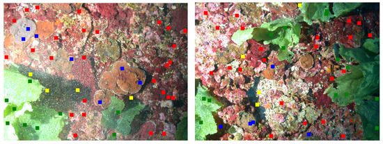 Point-supervision: there are only 50 points pixel labels in each image, blue color represents coral, green color represents green algae, red color represents red algae, gray color represents rock and yellow color represents other species.