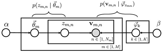 There are two processes of LDA: one is , the other is . Hidden variable z follows multinomial distribution which is shown in Equation (A5) and we show the equations of the first process as follows.