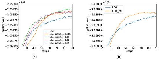 (a) log-likelihood for LDA with or without spatial coherence; (b) log-likelihood for LDA with or without MI regularization.