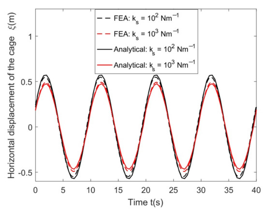 In Figure 2, the effects of different values of mooring stiffness on the cage horizontal displacement between the FEA numerical simulations and analytical results are compared versus time (s) for water depth () = 50 m, cage radius () = 3 m, and cage height () = 7 m, and the other parametric values are the same as defined in Table 1. It is observed that the results of the horizontal displacement of the cage decrease with an increase in the values of mooring stiffness in both models. This shows that, with the increase in the mooring line stiffness, the floating cylindrical cage becomes more stable, and as a result, the displacement decreases. Further, it is found that the displacement between the FEA numerical model simulations and analytical results are in good agreement with respect to the same values of mooring stiffness.