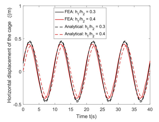 Figure 3 compares the horizontal displacement of the cylindrical flexible net cage for different cage heights between the FEA simulations and analytical results with , and the other parametric values are the same as defined in Table 1 versus time t (s). From comparing the results, it is seen that the effects of the cage height on the horizontal displacements are similar, and the peak values are in good agreement in both models. When the ratio between the cage height and water depth is 0.3, the amplitude of the horizontal displacement from the FEA model is 0.903 m, which is 0.8% lower than the one from the analytical model. When the ratio increases to 0.4, the amplitude of the horizontal displacement from the FEA model is 0.826 m, which is 2% higher than the one from the analytical model. Further, it is found that, as the cage height increases, the horizontal displacement increases, which suggests that, for taller structures, the horizontal displacement becomes more with certain values of the current speed and mooring stiffness.