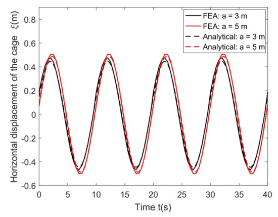 Figure 4 shows the comparisons of horizontal displacement between the numerical FEA simulations and analytical results for different radii of the cage versus time with the same values of parameters: water depth , cage height , and mooring stiffness . From Figure 4, it is observed that, as the radius of the cage increases, the horizontal displacement of the cage increases. From the FEA model, the amplitude of the horizontal displacement of the cage with a diameter of 3 m is 0.942 m, which is 6.4% lower than the one of the cage with a diameter of 5 m. Meanwhile, from the analytical mode, the amplitude of horizontal displacement of the cage with a diameter of 3 m is 0.927 m, which is 6.1% lower than the one of the cage with a diameter of 5 m. This is due to the fact that the area of the cage increases, and consequently, the area exposed to the wave loads increases.
