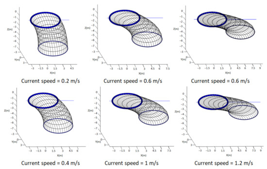 Figure 5 depicts the cage deformations for different current speeds of 0.2 m/s–1.2 m/s, with other parametric values defined in Table 1. It is observed that the deformation of the flexible net increases with the current speed. The collar does not deform much due to its high stiffness. The larger current provided larger hydrodynamic forces, which results in a larger horizontal deformation and lower height of the cage. Therefore, the volume of the cage reduces rapidly under a large current. The observations of the cage deformations under the current are similar to [9,11,28]. The blue lines are spring elements that represent the mooring system. The compression stiffness of the spring is set to zero, so there is no force from the downstream mooring, even if it is compressed.