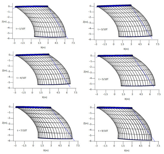 Figure 6 shows the shapes of the cage at different moments in one period when the current speed is 0.5 m/s, the wave height is 1 m, and the wave period is 10 s under the effect of both the current and waves. The general observations are similar as in Figure 5. However, the deformation of the net varies slightly during one period, so the shape and the volume of the cage do not change much. Further, it can be observed that the motion of the cage is close to the motion of the wave, so it is hard to tell the differences between the shapes of the cage under different times in one period, especially when it is a 3D view. However, some differences can be seen after scales are added and the view direction is adjusted. In Figure 6, firstly, the tilt angles of the collar and the bottom ring vary. Secondly, the height of the cage also varies. The cage does approximate a rigid motion with wave fluctuation. The deformation and mooring force under different currents and waves are also studied in [12,15].