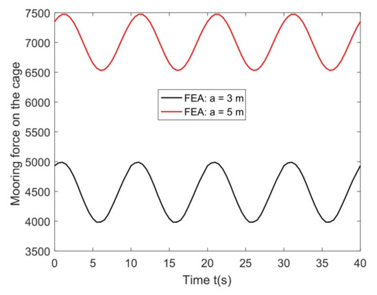Effects of the cage radius on the mooring force versus time t(s) with a water depth , cage height , and .