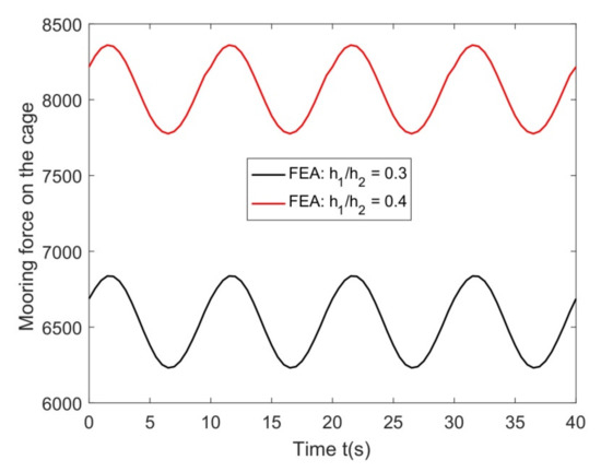 In Figure 8, the effects of different cage heights on the mooring force versus time (s) with a water depth , , and are plotted. It is observed that mooring force increases with an increase in cage height, which is due to the area of the cylindrical cage increasing, and consequently, the area exposed to the wave loads increasing.